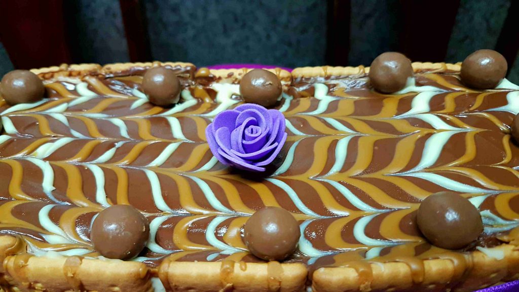 بسكوت شاي ساده..رصيته في قالب بيتفح على الجناب…وغمست شويه حطيتهم في القعر…وسيحت شيكولاته في كريمه الخفق السخنه..وحطيت طبقه…وحطيت طبقه بسكوت تاني..وهكذا..نهيت بطبقه كريمه..وباقي صوص الشيكولاته..وذوقتها…