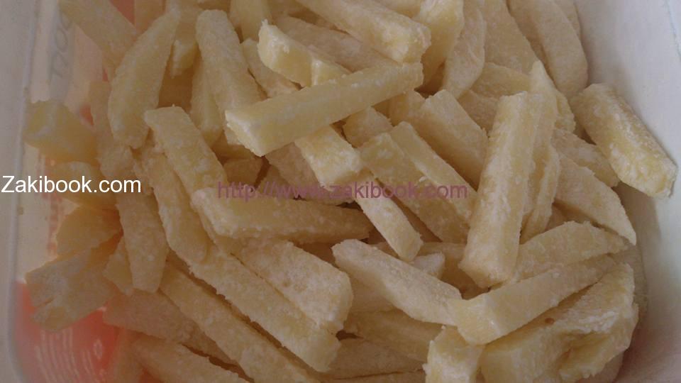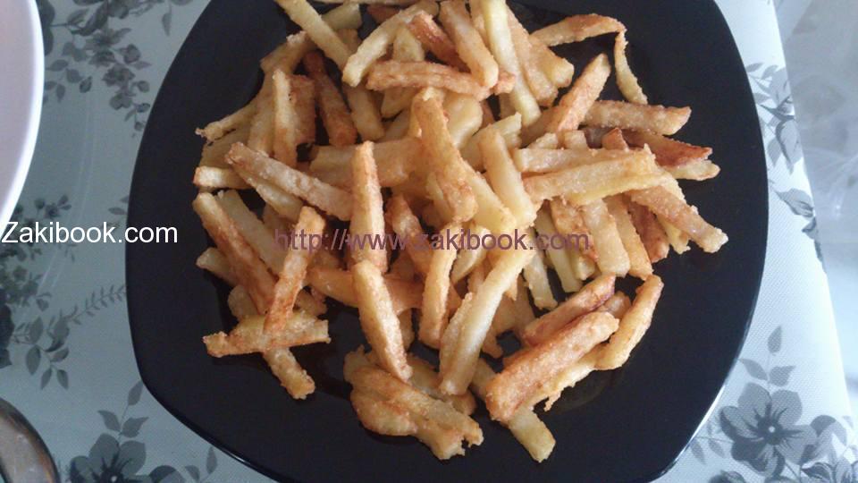 – في زيت غزير وحامي قلي حبات البطاطا, ثم نخرجها ونصفيها من الزيت الفائض وذلك بوضع ورق نشاف في أسفل الصحن.
