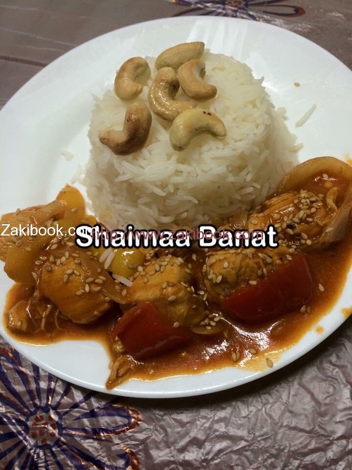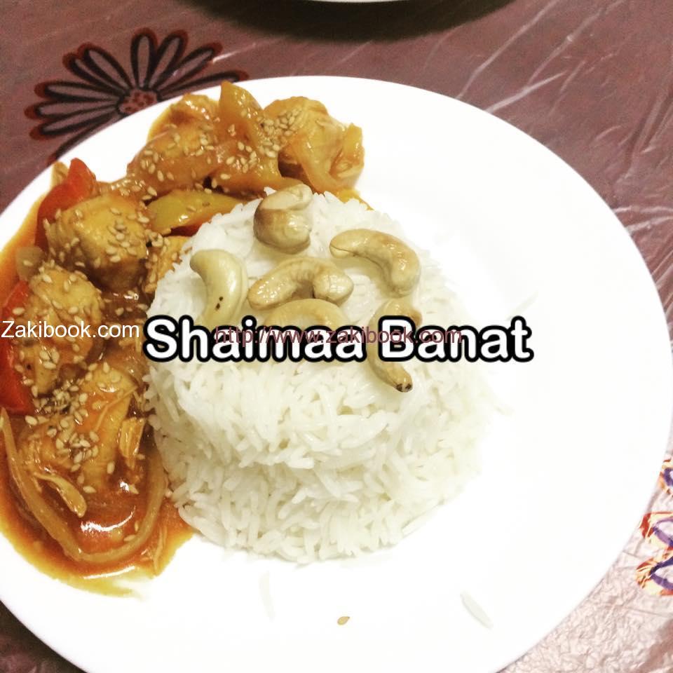 – و اخر اشي حطي كاسة ماء مع ملعقه نشا ونص باكيت رب البندور و طبخيهم حتى يسمك المزيج, ونرش على الوجه ملعقة كبيرة سمس ويقدم بجانب الأرز الأبيض.