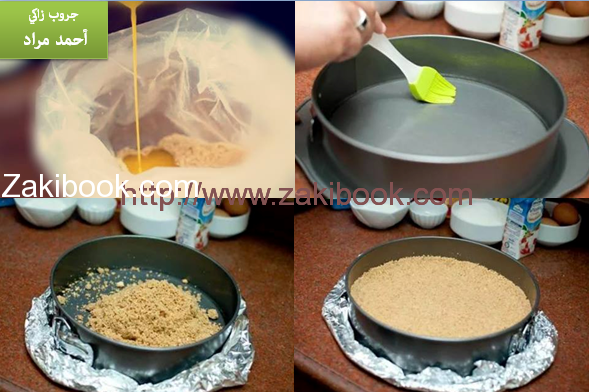 نخبز تشيز كيك في حمام مائي، نغلف صينية تشيز كيك بورق السلفان لكي لا يصل الماء له،