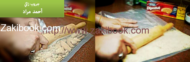 – نضع البسكويت في كيس (نايلون) مثل يلي بالصورة ثم نبرحه ضربا بمرق العجين (شوبك) او المدقة.