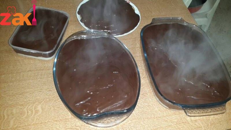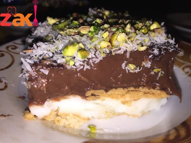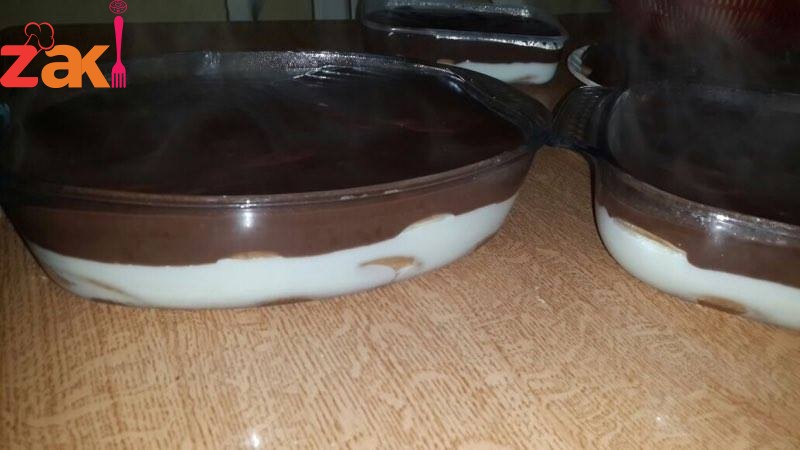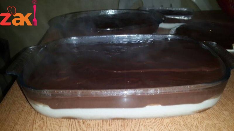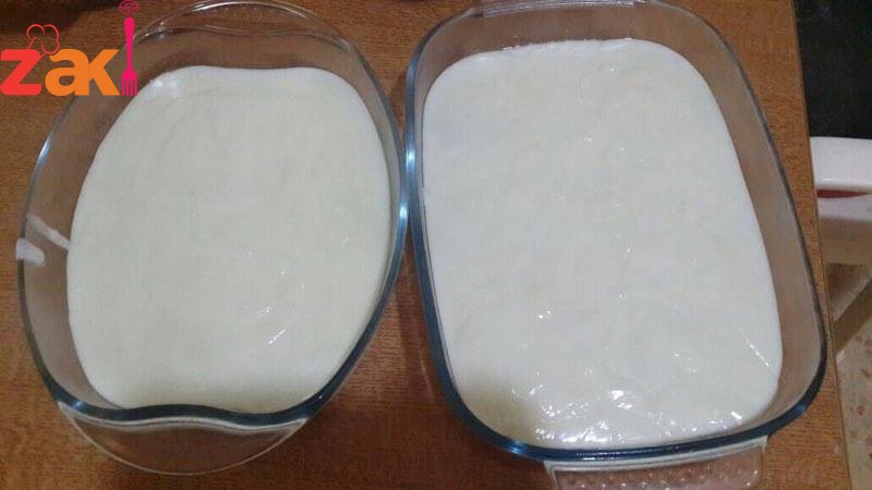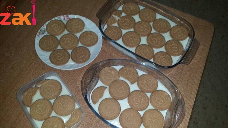 و يوضع بسكويت في الصواني و يسكب المزيج الأبيض فوق البسكويت
