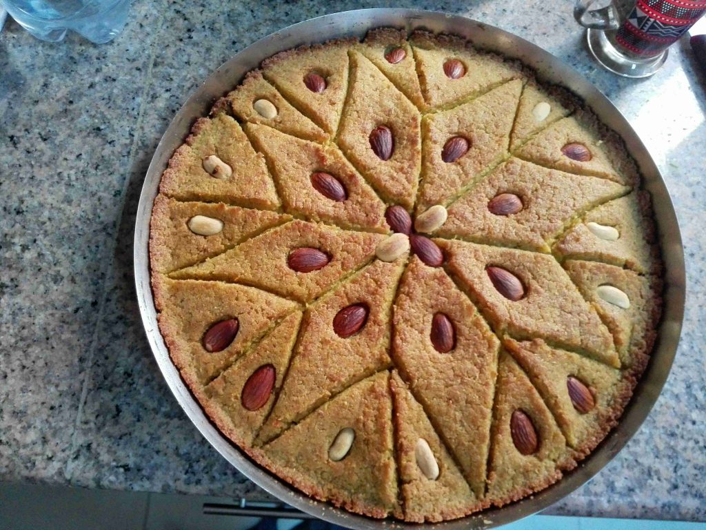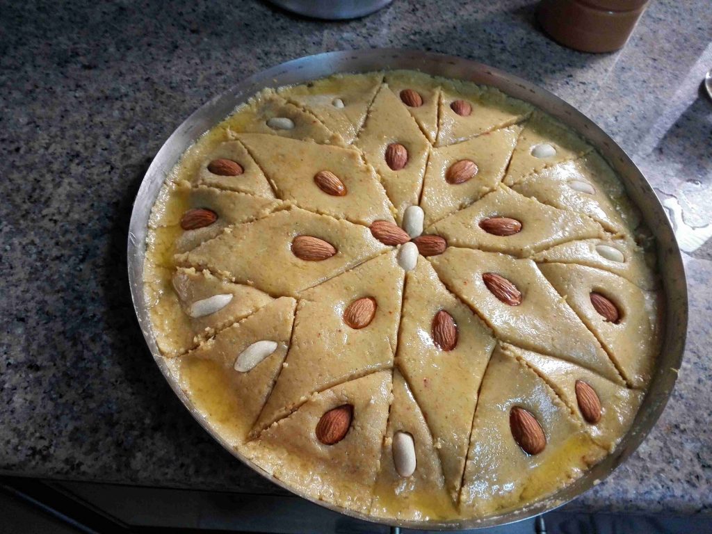 مندهن الصينية بالسمنة الوفيرة ولنجاح شكلها منقسم العجين قسمين منفرد اول قسم على كيس التفريز ومنحطها عالصينية ومنحط الحشو ومنرجع منفرد العجينة التانية ومنضغط عليها واهم شي الأطراف ومنحطها فوق الصينية ومندهنا سمنة ومنقطعها ومنزينها بالمكسرات