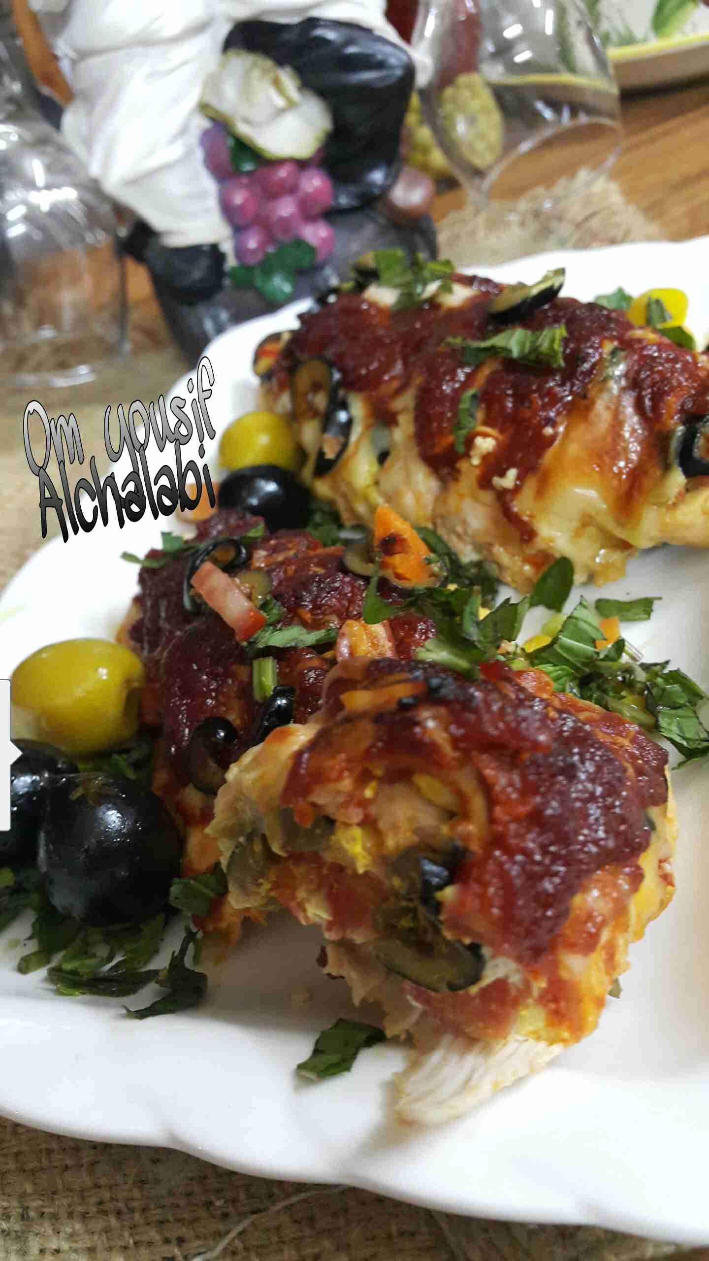 صدر دجاج محشي تغسل قطعتين من صدر الدجاج جيدا وتقطع بالطول دون الوصول للنهايات ثم يملح ويتبل بالزنجبيل والليمون ورشة ليمون دوزي ثم يوضع الحشووو الحشووو … زيتون منزوع النوى مقطع شرائح وطماطة مقطعة قطع صغيرة وفلفل اخضر بارد مقطع قطع صغيرة ونعناع اخضر او بقدونس ثم توضع في قالب مبطن بورق الالمنيوم ويبرش الجبن على الوجه ..ثم نضع صلصة على الوجه وتدخل الفرن مدة 40 دقيقة .. ثم يحمر الوجه قليلا وتقدم والف عافية الصلصة؛؛؛ على نار هادئة نضع 4 ملاعق زيت الزيتون و2 ملعقة كبيرة صلصة الطماطم وملعقة كبيرة زنجبيل وملعقة كبيرة بصل باودر ورشة ملح و3 ملاعق ليمون و2 ملعقة دبس الرمان تخلط جميع المواد جيدا وتصب فوق قطع الدجاج .. ..