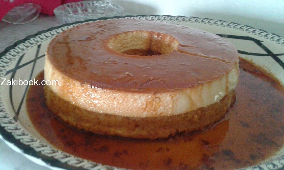 – ونضيف الخل والحليب البودرة والماء ونخفق بقوة الى ان يتجانس الخليط ونضيف برش اليمون ونضيف هذا المزيج فوق الكراميل في القالب.