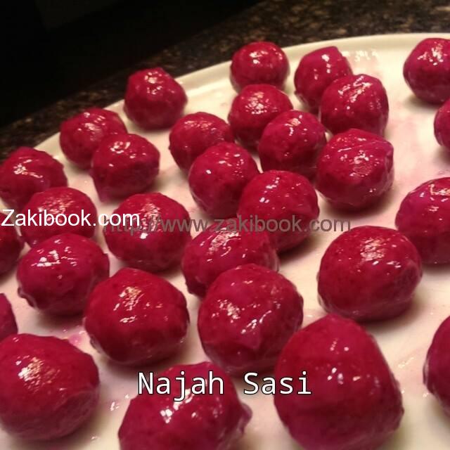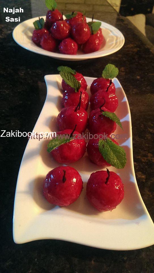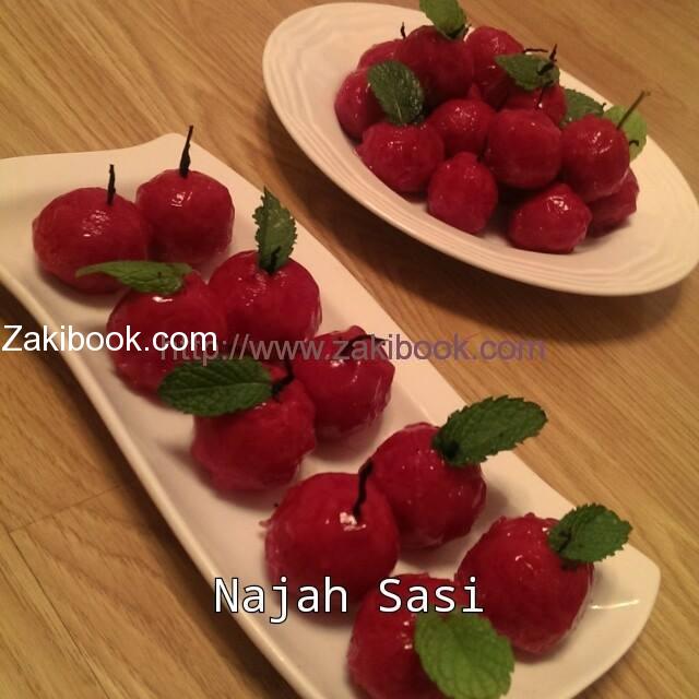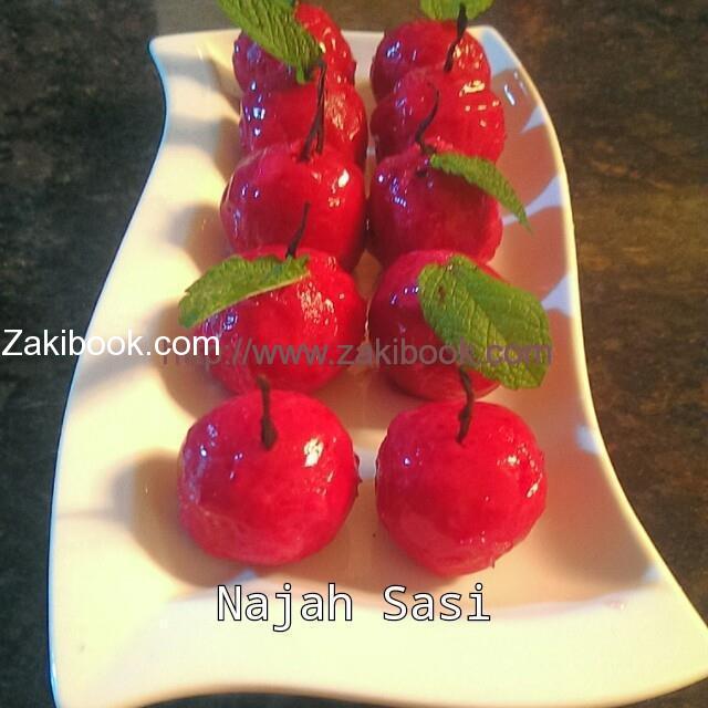 – تم نحضر التغطية وهي عبارة عن كوب ماء ومغلف جلي بنكهة الكرز وملعقة نشا بنحركهم على النار واول ما يمسك الخليط نغطس فيه الكور.