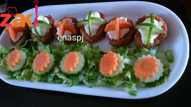 ثم يغلف بالخبز المطحون ويقلي في الزيت يزين بالجبنة الكريمي والخيار والجزر