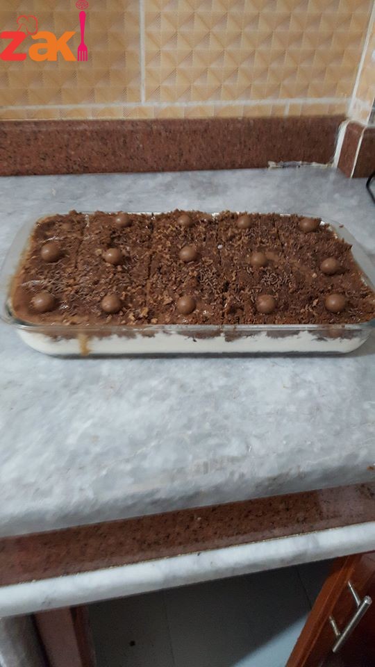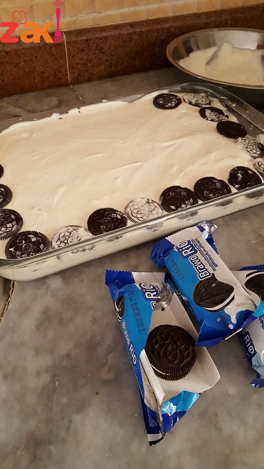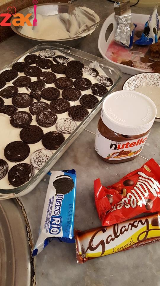 عبارة عن بسكويت اوريو يغمس في الحليب او العصير ثم يرص في الطاجين. مثل ما هو موضح بالصورة .الطبقة الرابعة ناخذ نصف الكيكة المحضرة مسبقا ونضعها فوق طبقة الاريو ونغطيها بطبقة من النيوتيلا او اي شكولاته سائلة اخرة ثم نبشر عليها شكولاته الجالكسي وحبيبات المالتيزرو .