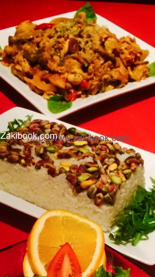 – نضع في وعاء التقديم مقدار قبضة اليد من الفستق الحلبي, ثم نضع الأرز ونكبس الأرز بواسطة ملعقة لكي يأخذ شكل الطبق, ثم يقلب ويقدم وصحتين وألف هنا.