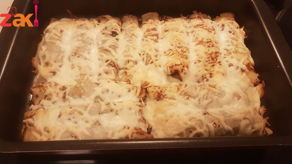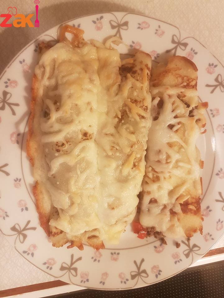 انا قمت بحشيها باللحم المفروم و الفطر و الذرة و جبن مبروش, بعد الحشي واللف صفيها بصينية و ادخليها بالفرن للتسخين و إذابة الجبن