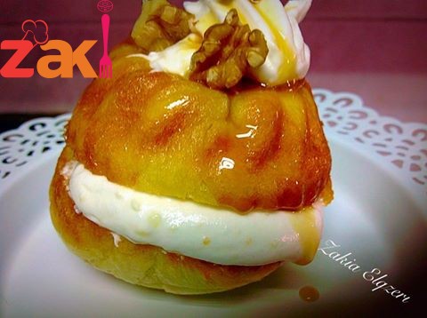 وقصيها من النص واحشيها كريم شانتيه مضروب مع فنجان قهوة سكر ناعم ونكهة الفانيليا ومن فوق زينيها بشويه كريم ومربى المشمش او صوص الكراميل ووجبة هنيه ♥