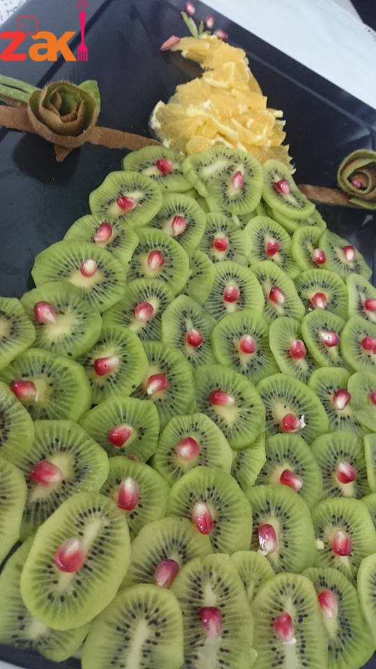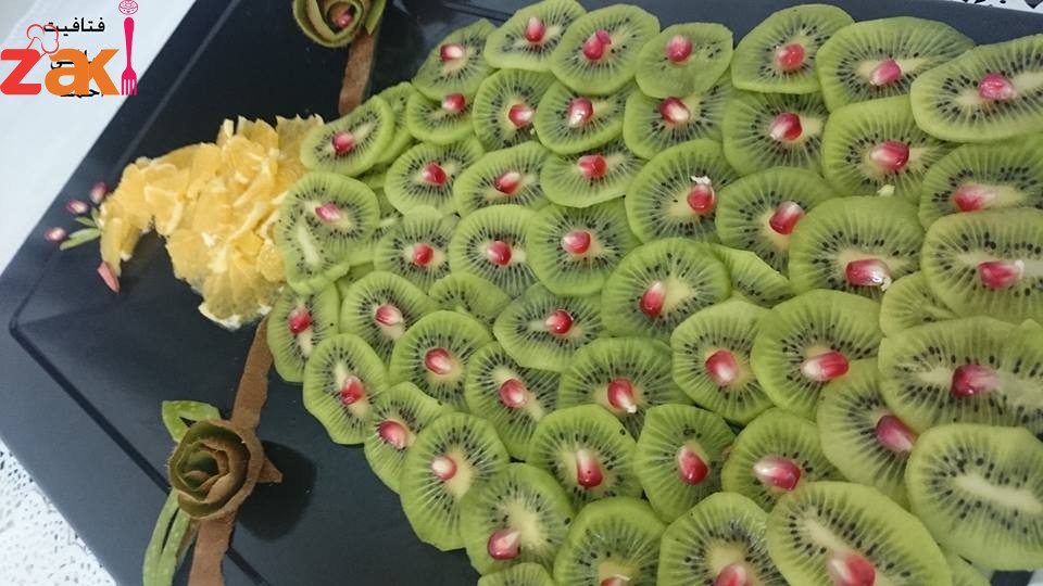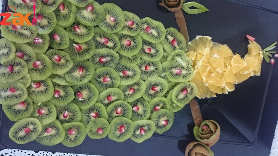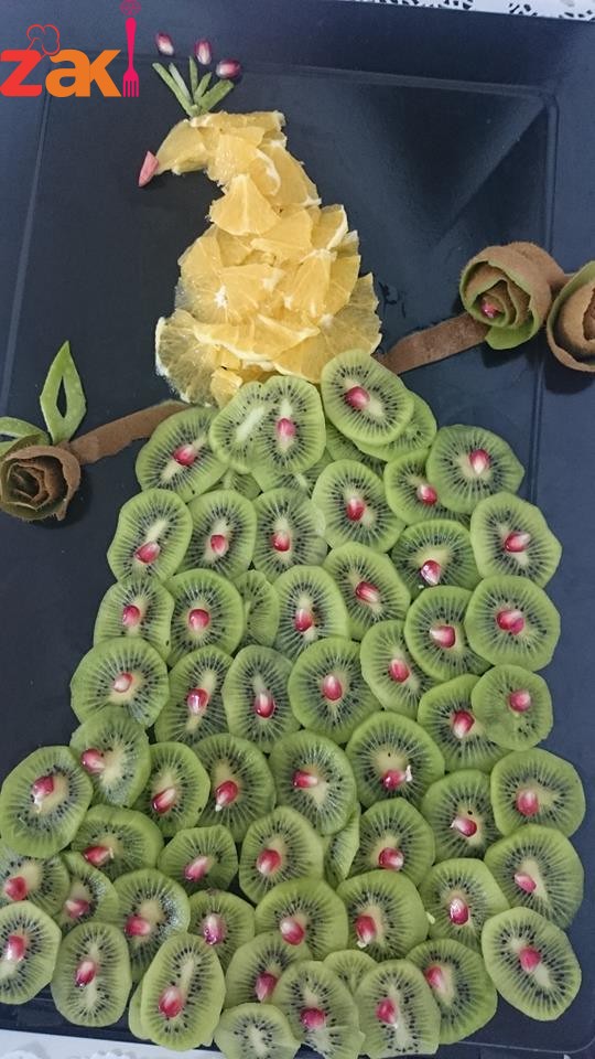 قطعي قطع الكيوي, وقومي بترتيبها لتشكلي جسم الطاووس, وضعي على كل حبة كيوي حبة رمان, ثم أكملي جسم الطاووس بقطع البرتقال