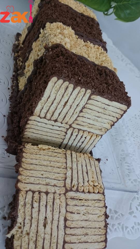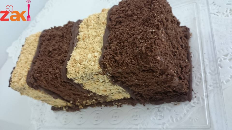 احضري البسكويت, وصفطيه كما في الشكل, والصقي كل طبقة مع الأخرى بالقليل من خليط الشكولاتة, ثم اسكبي ما تبقى من الخليط على الوجه, وضعيها في الثلاجة حتى تتماسك.
