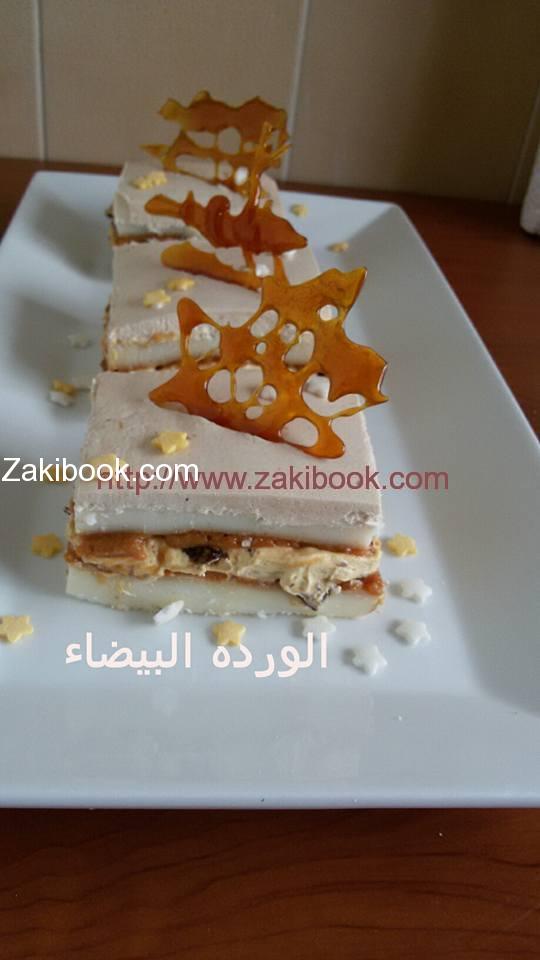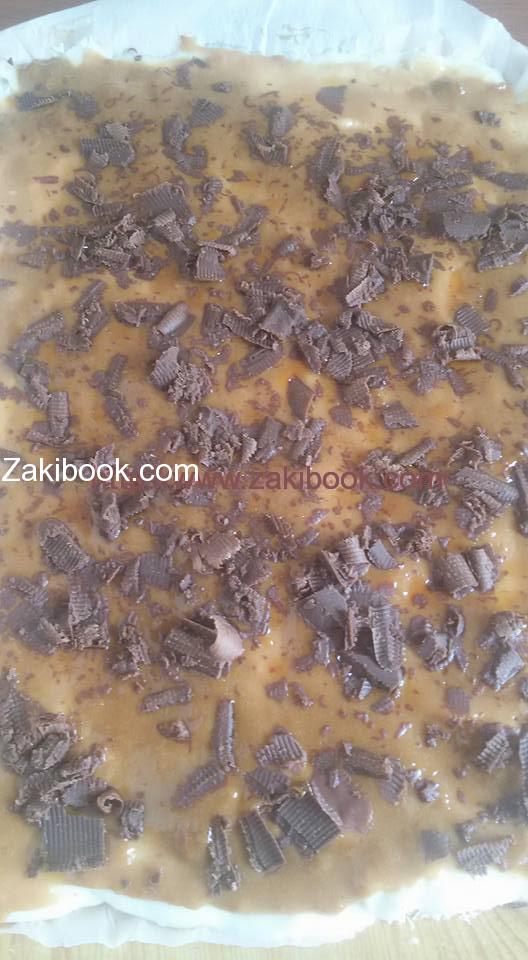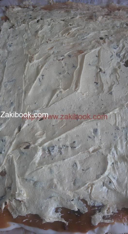 – وحطيت طبقة شكلاطة ابشرتها وبعدها حطيت طبقة شانتي مخفوقة مع كريم كراميل باودر و خفقتها جيدا ووضعتها ساعة في التلاجة.