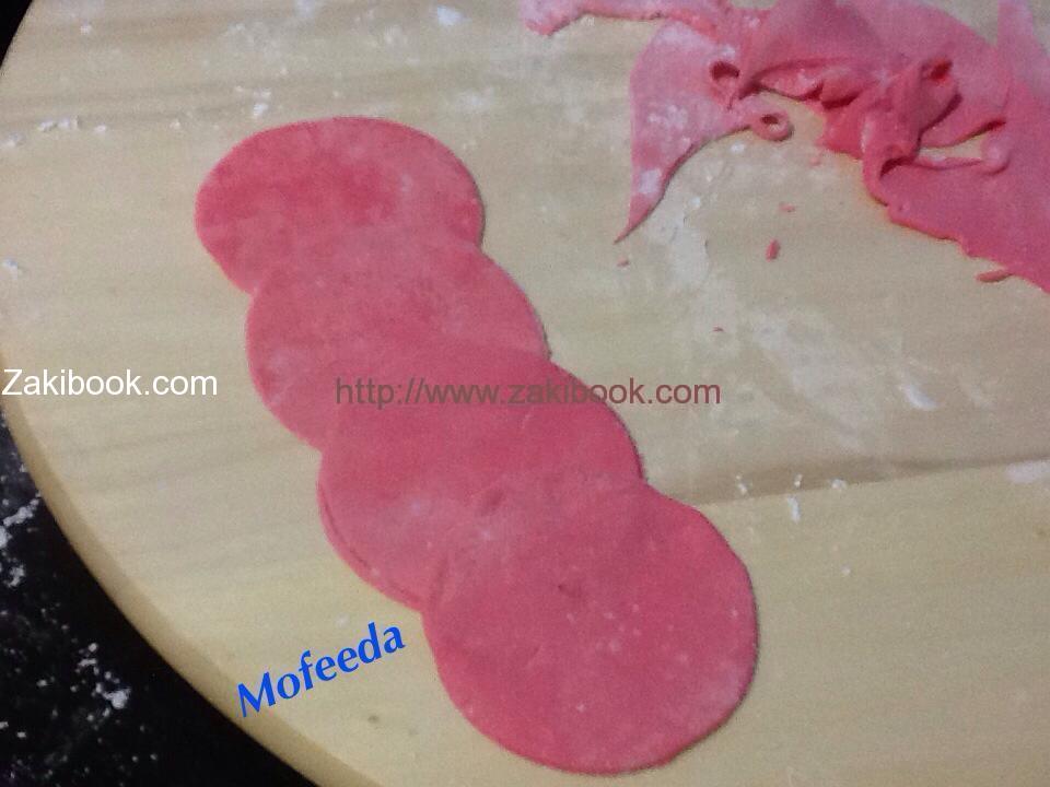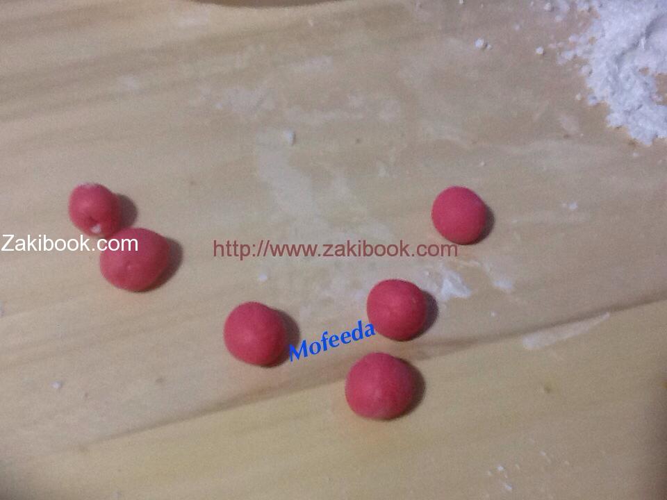 – نصبغ العجينة باللون الأحمر, ونصنع كرات صغيرة لتزيين الكيكة من الأطراف.
