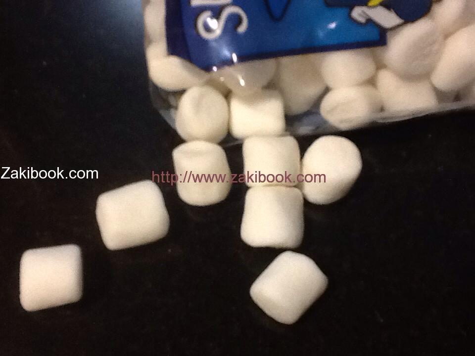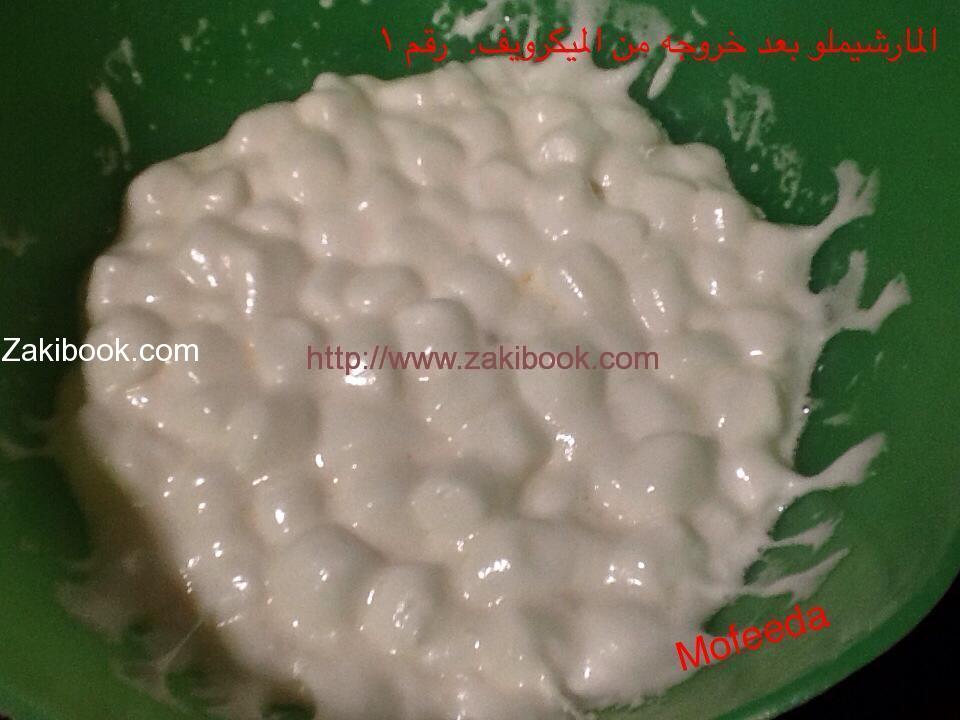 – ندهن وعاء يدخل المايكرويف بسمنة جريسكو من جميع الجوانب, ونضع المارشميلو والماء وتدخله الميكرويف لمدة 40 ثانية.