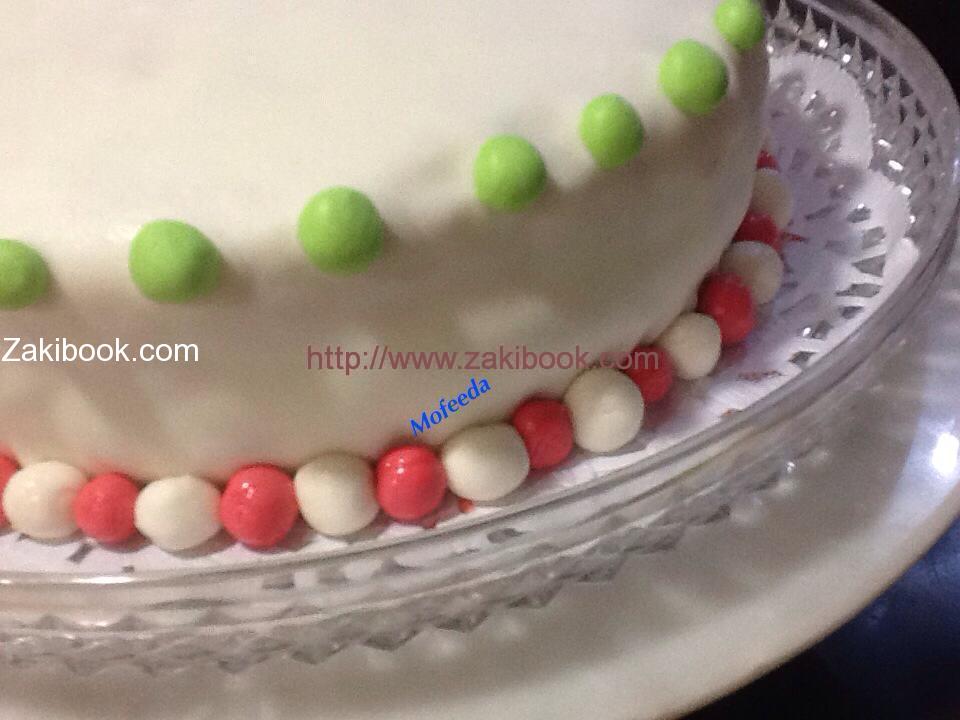 – نضع كرات صغيرة من عجينة المارشميلو أو الفوندان على أعلى داير الكيكة, كما في الشكل.