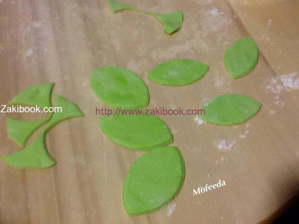 – بواسطة ماء مذاب مع سكر ناعم نلصق الأوراق, ونحاول عمل خطوط بواسطة السكين, لتعطينا نفس شكل الورقة الطبيعي.