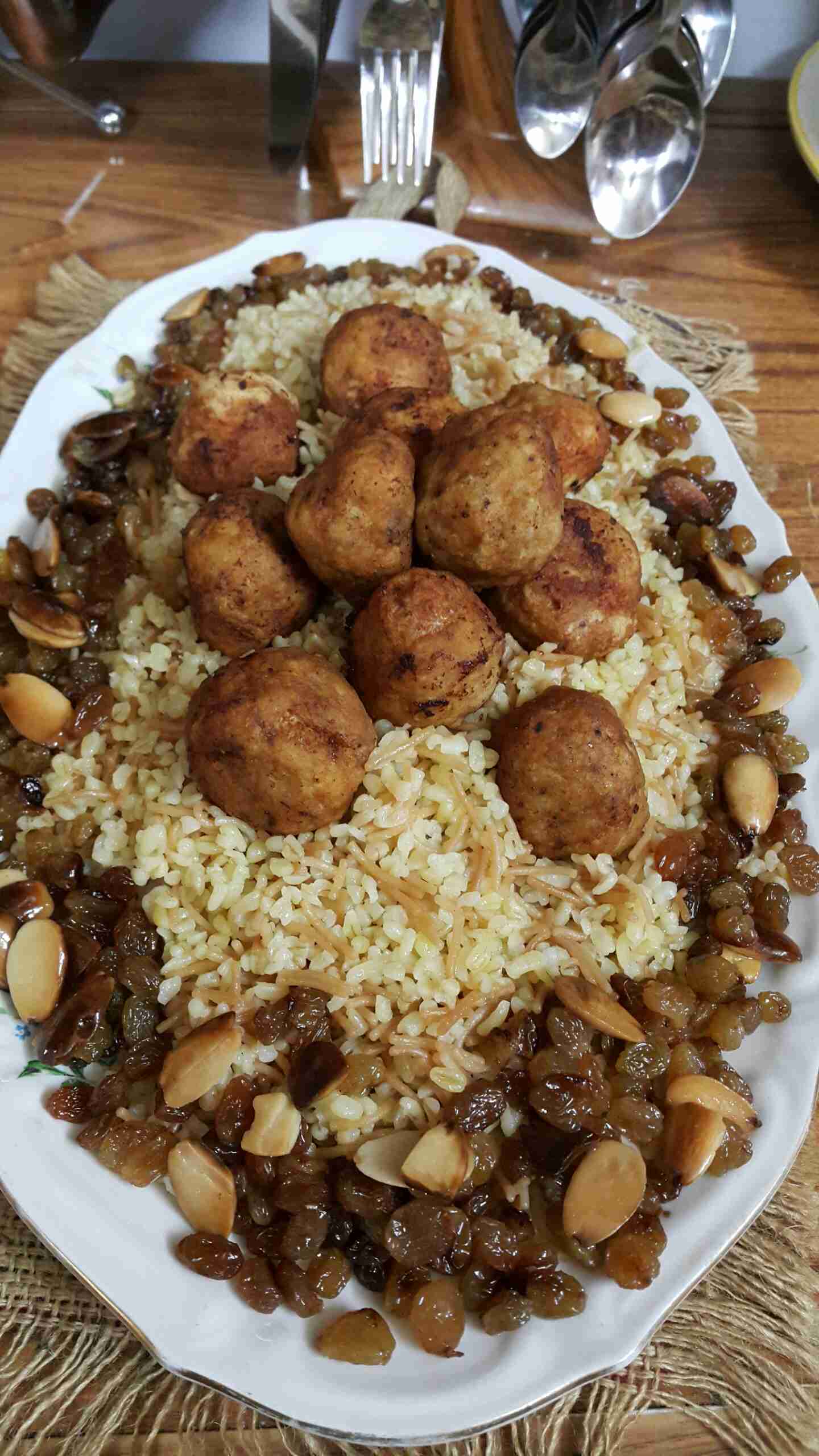 ينقع كوبين ونصف برغل في كاسة باضافة الماء له يترك مدة ربع ساعة ثم على نار متوسطة نضع قليل من الزيت ونحمس كوب شعرية الى ان تحمر يضاف البرغل ويضاف فوقه ماء بحيث يكون مستوى الماء اكثر منه بمقدار اصبع يترك الى ان ينشف الماء يضاف له الملح ويترك على نار هادئة الى ان تستوي الحبةيقدم في طبق ويضاف له الكفته على الوجه ويزيين بلكشمش واللوز ملاحظة /ينقع كوب كشمش في ماء مدة عشر دقائق ثم يحمس بقليل من الزيت ويستخدم ومليووون عافية لاتنسووو ذكر والدتي بالرحمة والدعاااء ام يوسف ..