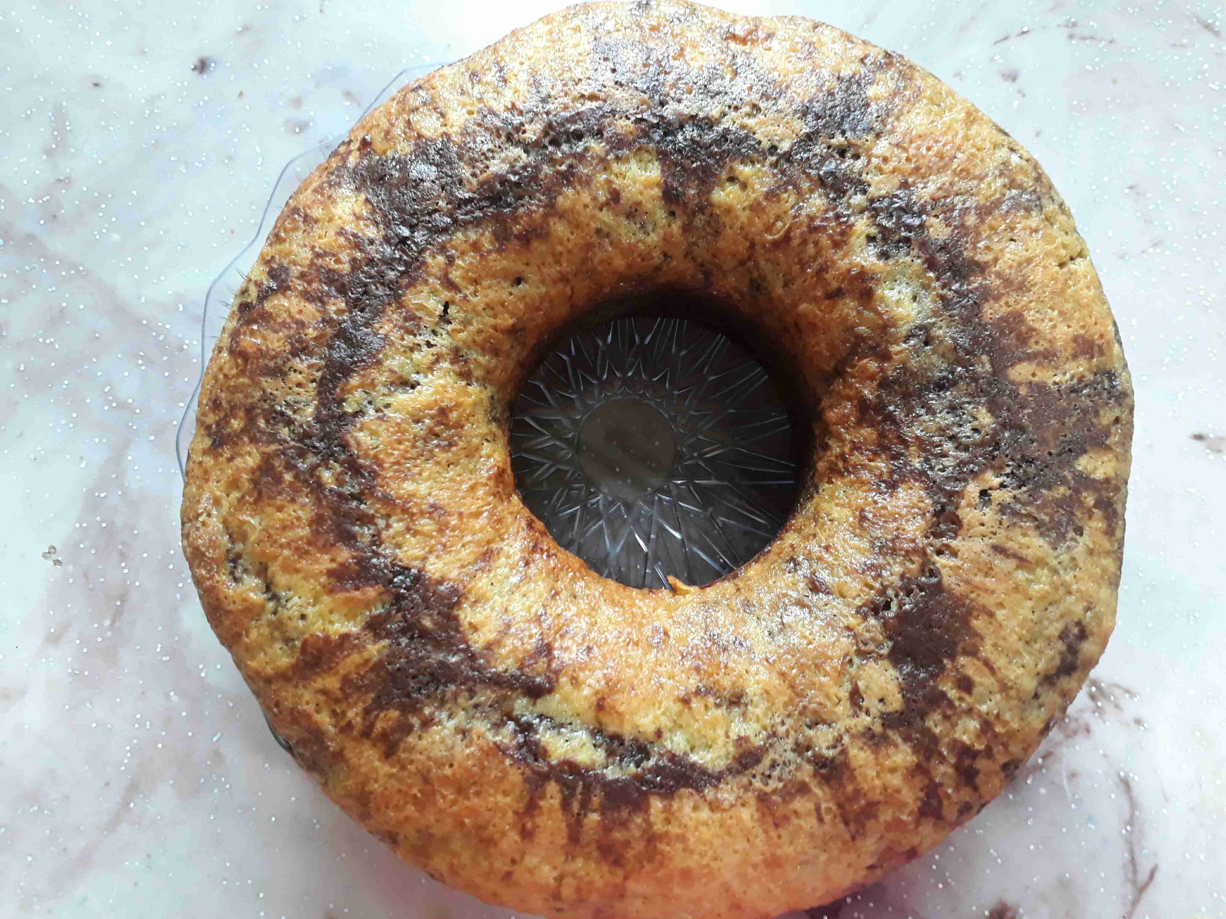 نخلط البيض والسكر جيدا…ثم نضيف الزيت والطحين و العصير بلتناوب وباقي المكونات…اقسم العجينة نصفين واضيف لاحدهما الكاكاووو…اصب في قالب الكيكة عجينة سادة ثم عجينة كاكاووو وهكذا بلتناوب…