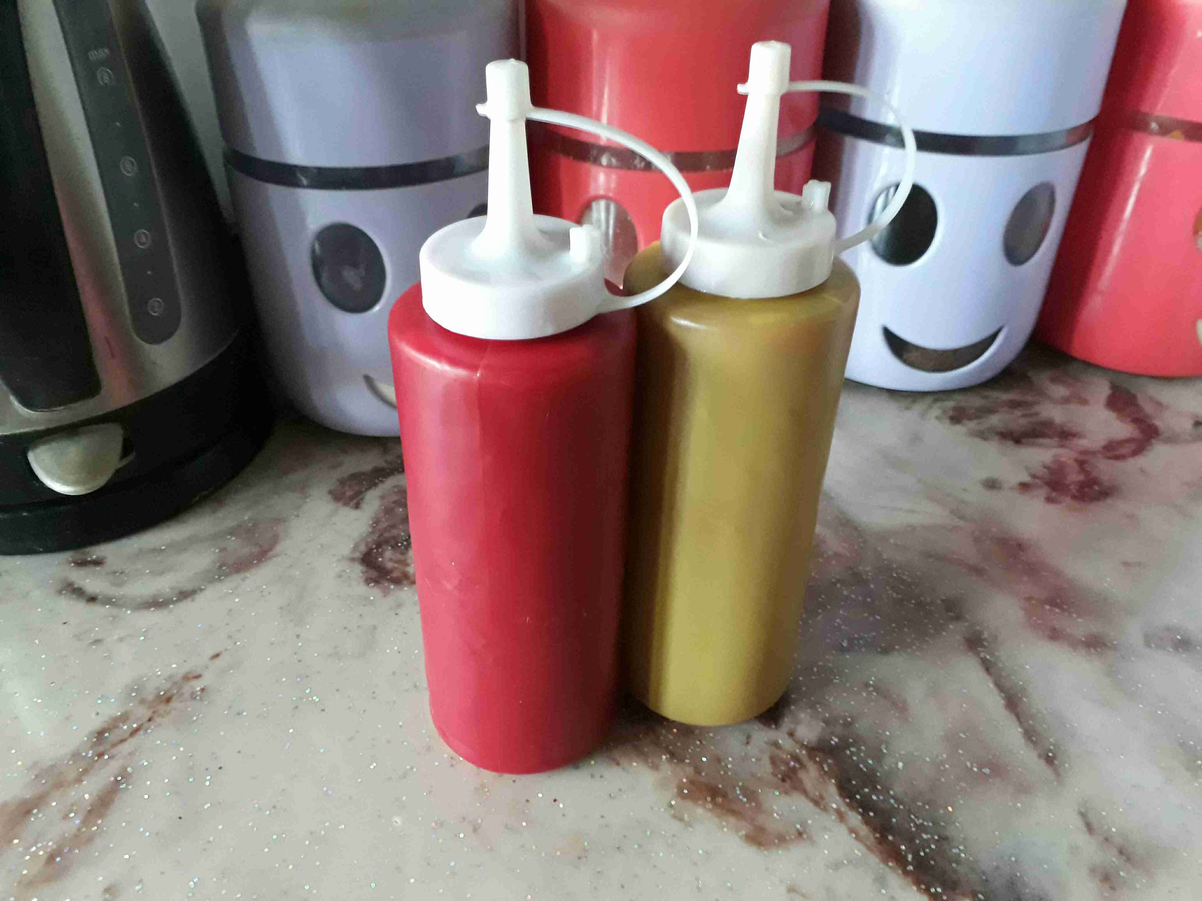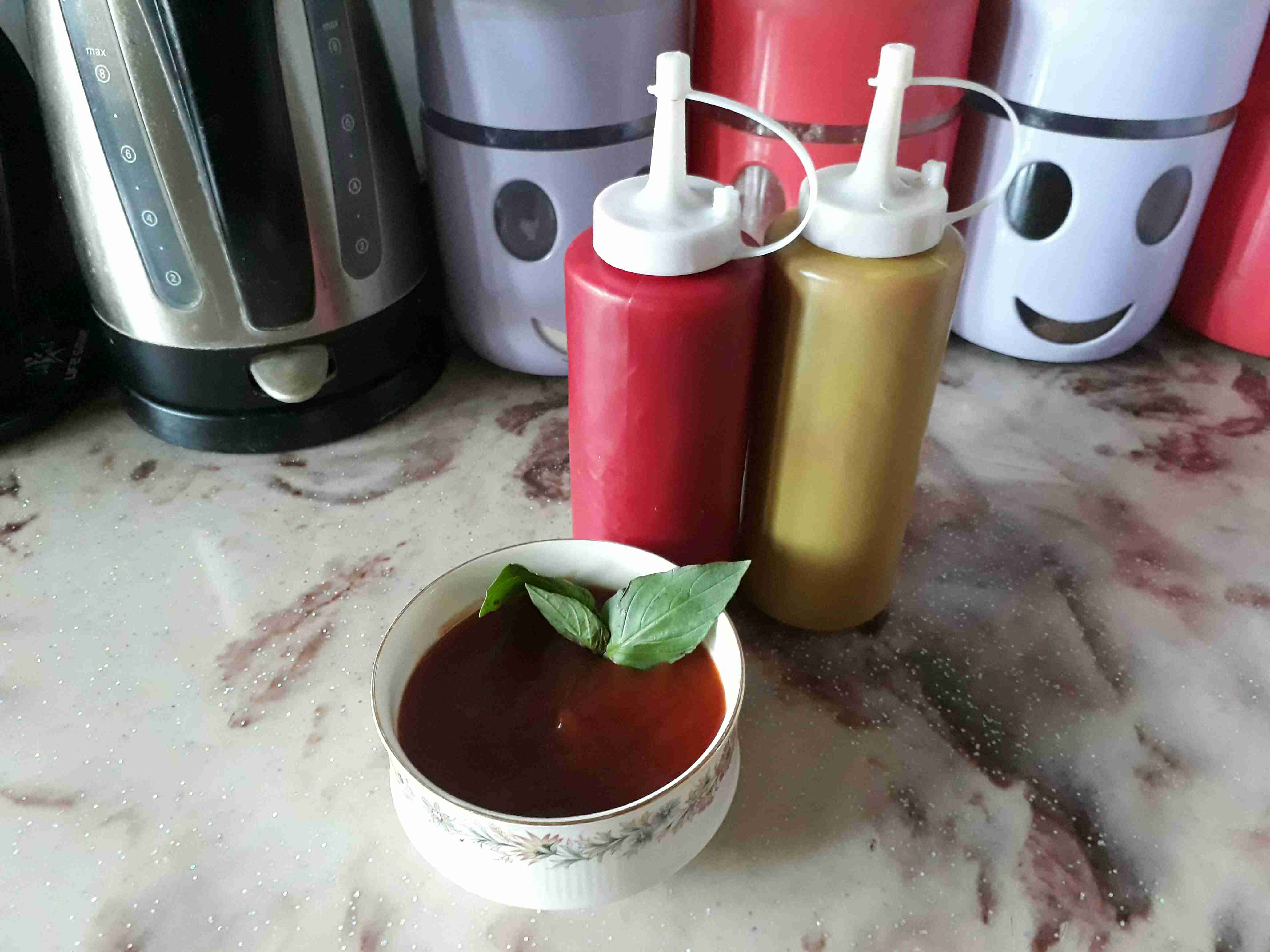 • كوب سكر…كوب خل اي نوع…كوبين ماء…ملعقة كوب ملح…ملعقة شاي بهارات همبرغر…كوب معجون طماطة…3 ملاعق كبار نشأ…
