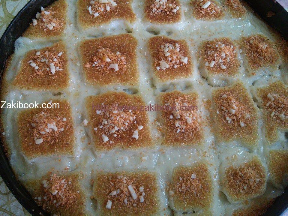 – نخلط جميع المكونات مع بعض ونضعها في صينيه مدهونه طحينه أو زبدة وعلى الوجه بكيس الكريما نضع علبه قشطه جاهزه او قشطه منزليه ونوزعها على شكل مربعات وبالفرن على حراره 180 حوالي نصف ساعه ونشوي الوجه تحت الشوايه بعد ما يستوي القاع ونضيف القطر فاتر.