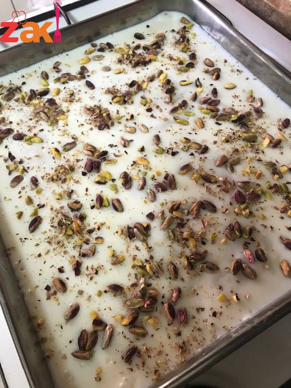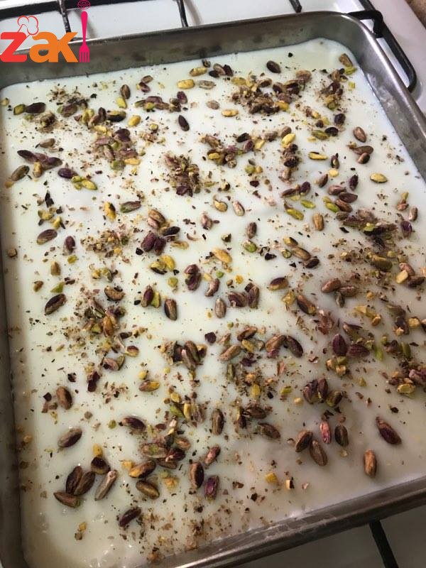 ثم يضاف وهو ساخن فوق الخبز المحمص ويزين بالفستق الحلبي المطحون أو الجوز ويوضع بالثلاجة