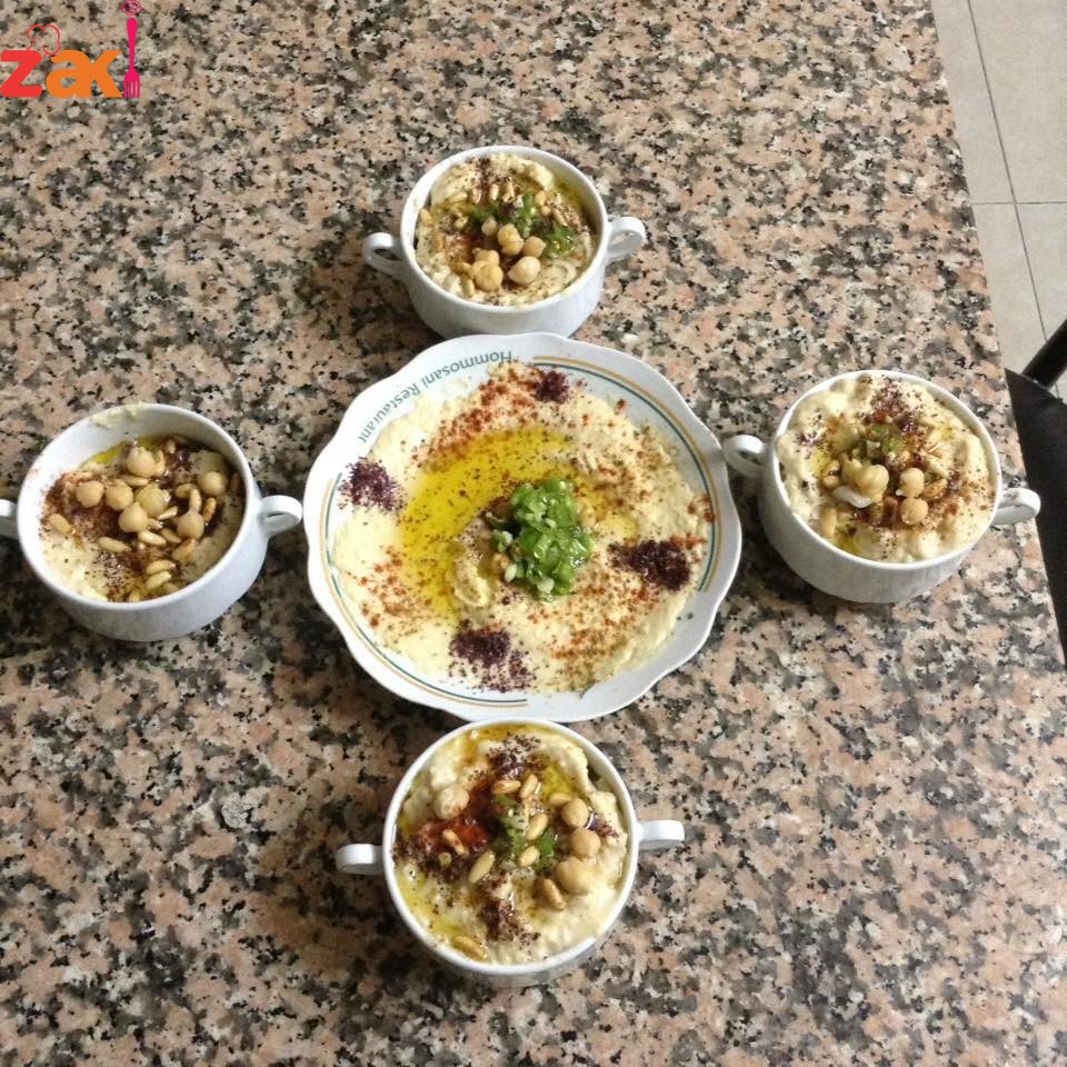 تخلطي الحمص بالطحينية وليمون وملح يخلط وبدار على خبز الحمام ويخلطه مع بعض ويزين بالسماق والصنوبر وزيت الزيتون