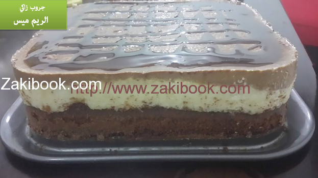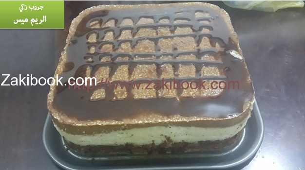 نضع جميع مقادير الطبقة الثالثة على النار حتى يغلي الخليط نتركه قليلا حتى يبرد ثم نسكبه على الطبقة الثانية, ونترك الكيكة في الثلاجة لمدة 4 ساعات حتى اليوم التالي.