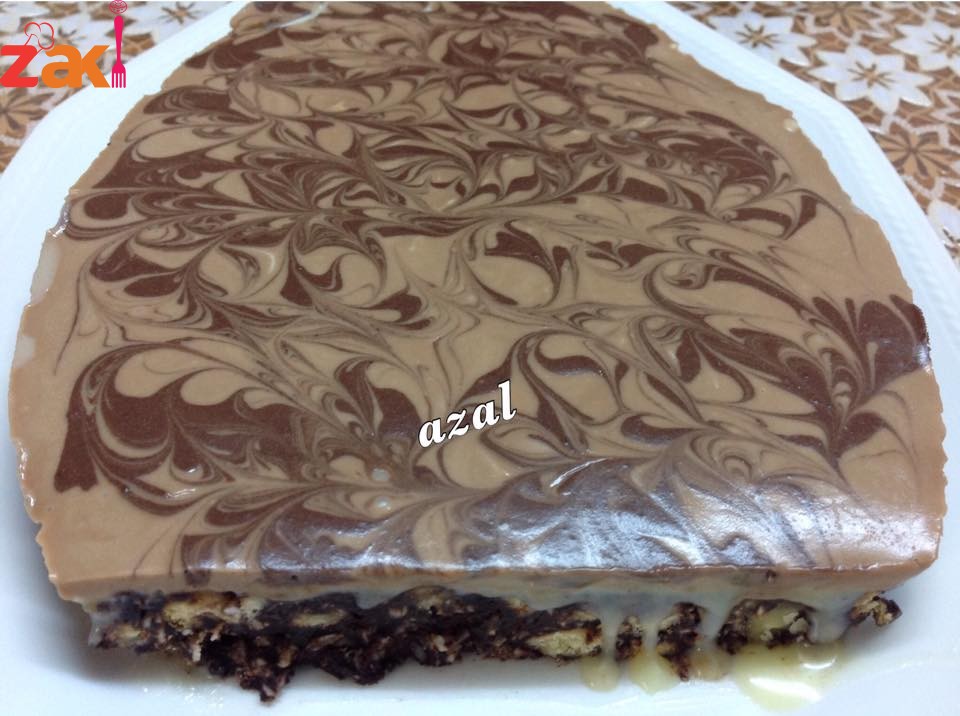 مئة غرام شكولا يسيح على حمام مائي ثم يضاف اليه علبة قشطةوملعقة زبدة تخلط المواد ثم تضاف فوق الطبقة الثانية يعاد الى الثلاجة حتى تتماسك وتقدم.