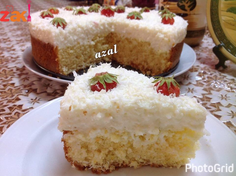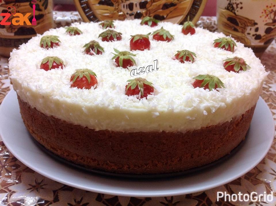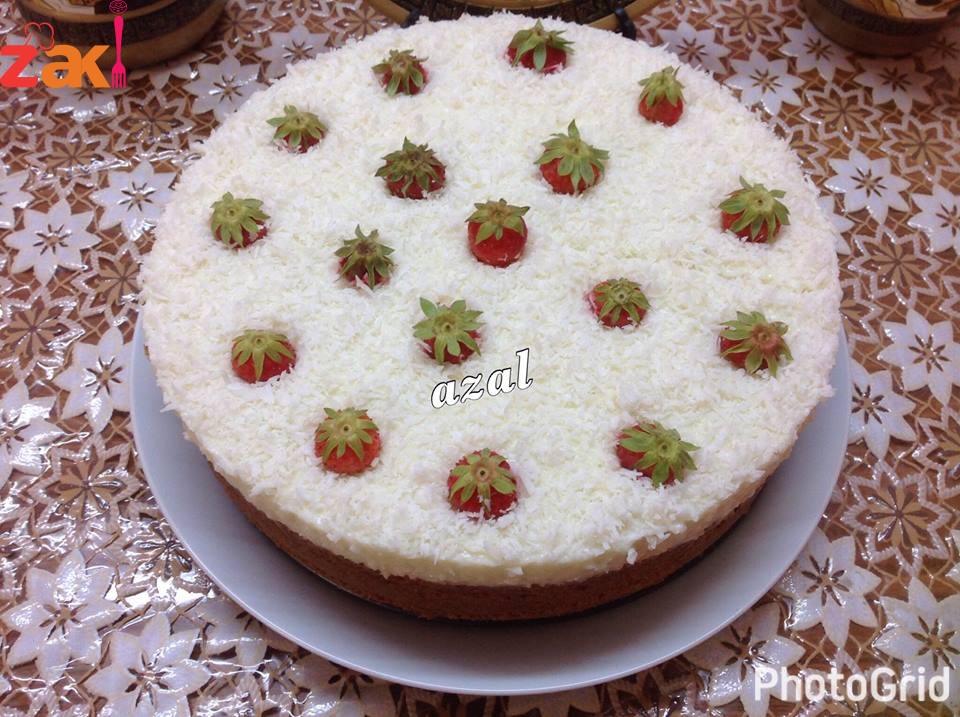 ثم نضع عليه الخلطة البيضاء يرش بجوز الهند ويزين بحبات الفراولة ويوضع في الثلاجة ساعتين تقريبا ويقدم.