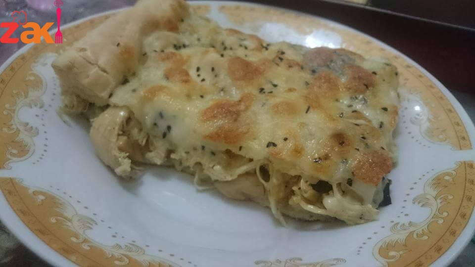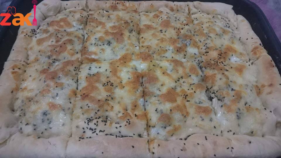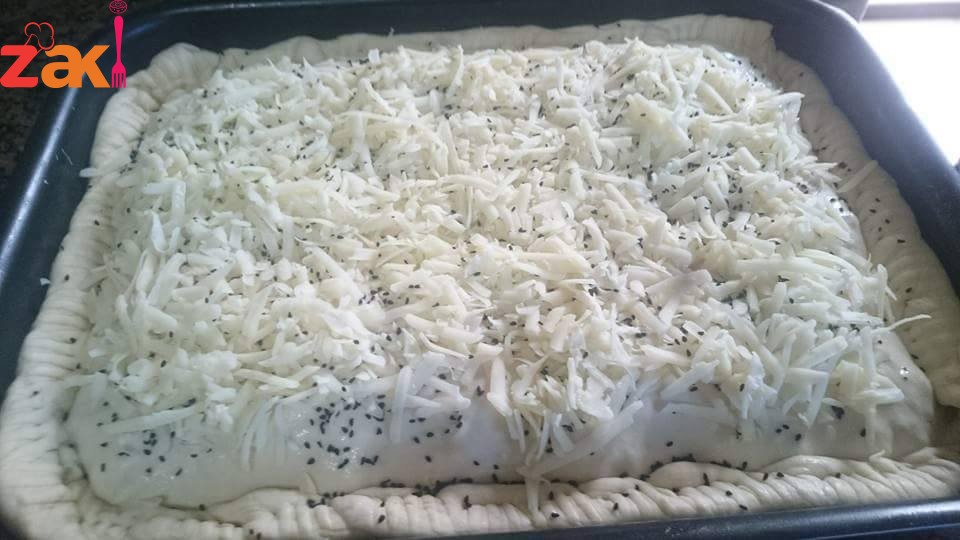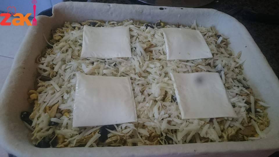 وبنحط الحشوه وفوقها جبنه موزيريلا وقشقوان وجبنه شرائح اذا حبيتوا وبعدين بنحط طبقه العجين الثانيه وبنسكر من الاطراف