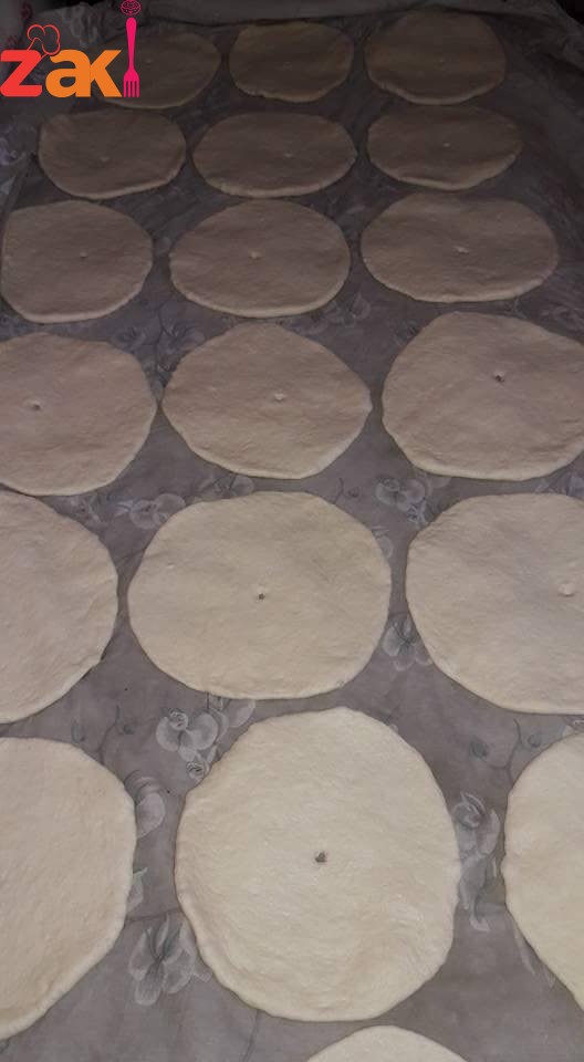 ثم يعجن بماء دافي لمدة ربع ساعه حتى تحصلي على عجينه طريه وناعمه وآخر شيء يدهن الوجه بزيت الزيتون ويغطى بنايلون ويترك ليختمر لمدة 30 دقيقه ثم يقطع ويرق ويريح 10 دقائق ثم نخبزه كما هو موضح بالصوره