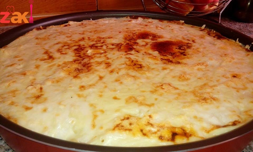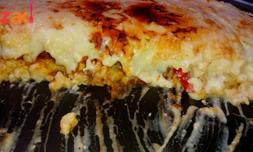 بعدين حطي بالصينيه طبقة معكرونه وحطي عليها بشاميل وحركيهم مع بعض الطبقه التانيه الخضار واللحمه و الطبقه التالته معكرونه واخر شي بشاميل وموزاريلا