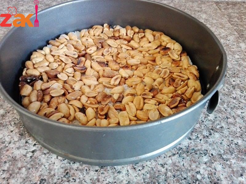 من ثم نسكب المزيج ونسوي السطح هلا طبفت الجوز هند بنفس الخطوه الاولى منعملها من ثم نسكبها فوق السمسم وطبقت الفستق