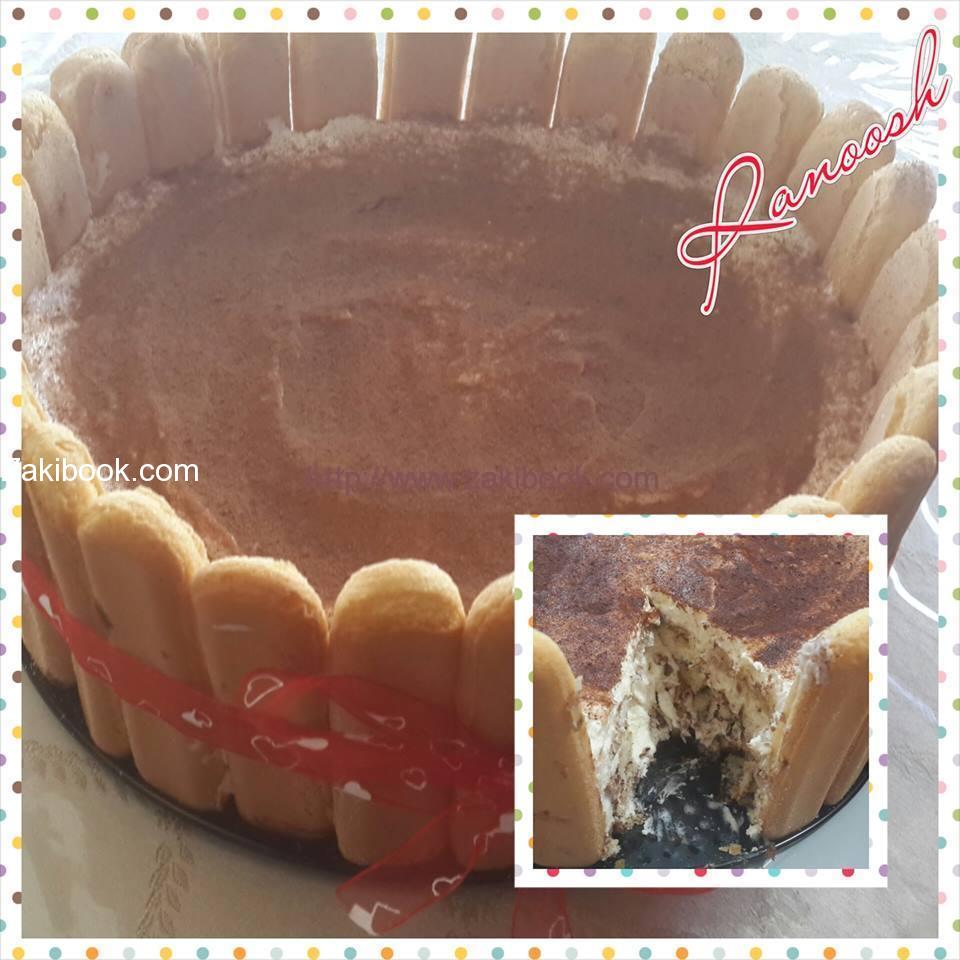 – نخلط الجبنة مع السكر, وفي جاط اخر نخفق الكريما مع الحليب و نضيف الكريما فوق الجبنة و نحط طبقة فوق الليدي فينكر وبنوقف علی الجوانب البسكويت وكمان في الوسط بسكويت مغمس بالكاكاو وباقي الكريما من فوق وبنرش كاكاو علی الوجه انا ما بحب النسكافيه فغمسته بالكاكاو وصحتين.