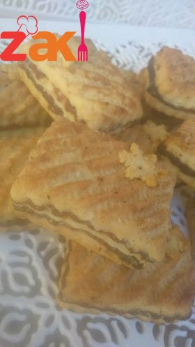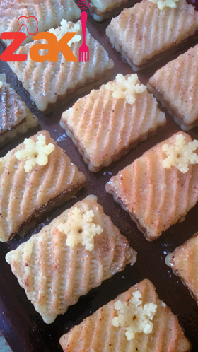 يقسم بالسكين مربعات أو مثلثات حسب الرغبة انا شكلته مربعات وشلت الزيادات يرش بالسكر الناعم المخلوط مع القرفة ثم يدخل الفرن بعد أن يرتاح قليلا بعد التشكيل حرارة الفرن 160 مئوية