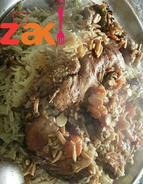 بكون الدجاج صار مستوي بنضيف بطاطا شرحات وفوقهم الرز بنرش عليهم زعفران منقوع او اذا مش متوفر ممكن ورق عصفر منقوع