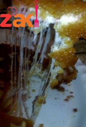 ثم نضع فوقه جبنه بيضه ومعها جبنه موزريلا وندخلها الفرن لمدة ربع ساعه ونحركها كل خمس دقائق ثم تقلب بصينيه اكبر منها وتشرب القطر وتزيين بالمكسرات (ملاحظه الجبنه يتم نقعها 6ساعات ونغليها مرتين حتى نتاكد انها اصبحت حلوة) القطر ثلاث كاسات سكر وكاستين ماء ومعلقه سمنه