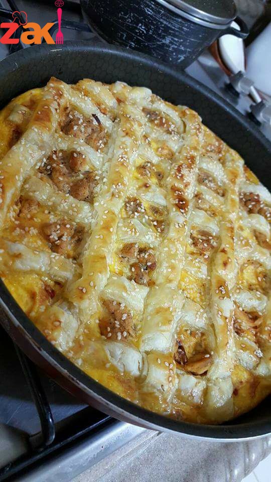 ضيفي الحشوة على نص العجينه يلي بالصينية وزعي البطاطا بشكل متجانس .