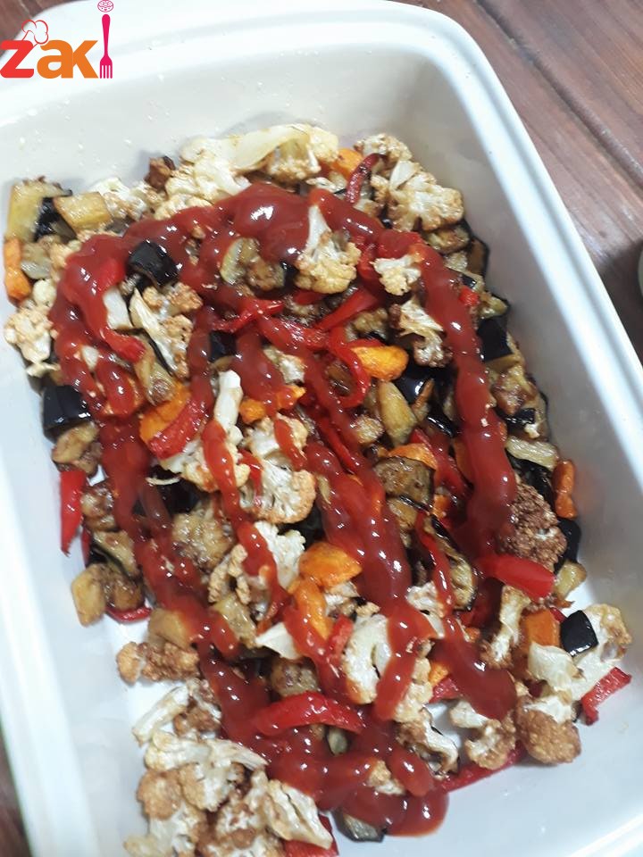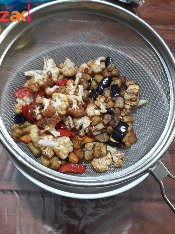 بتحطيهم بمصفاي مع الضغط عليه حتى تنزل كل الزيوت وحطيهم بالصينيه مع رشه ملح ومعلقتين كاتشاب وبتحركيهم مع بعض