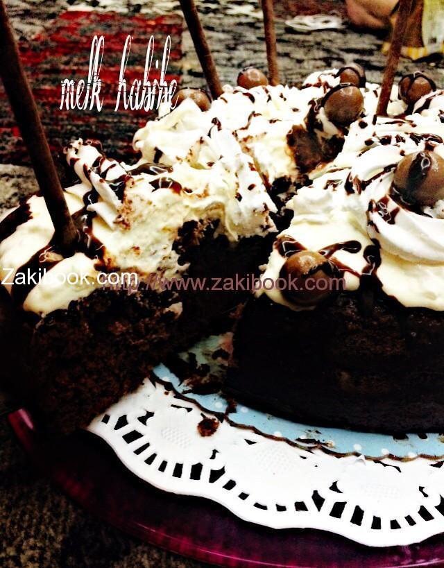 – اول ما الكيك يطلع من الفرن تركة يبرد ومن الوسط نفتح من الوسط دائري ونضع نص الحشوة والتي هي عبارة عن صوص الشكولاته وقطع السنيكرز ونغطي الوش بصوص شكولاته وندخلها التلاجه يمسك الصوص.