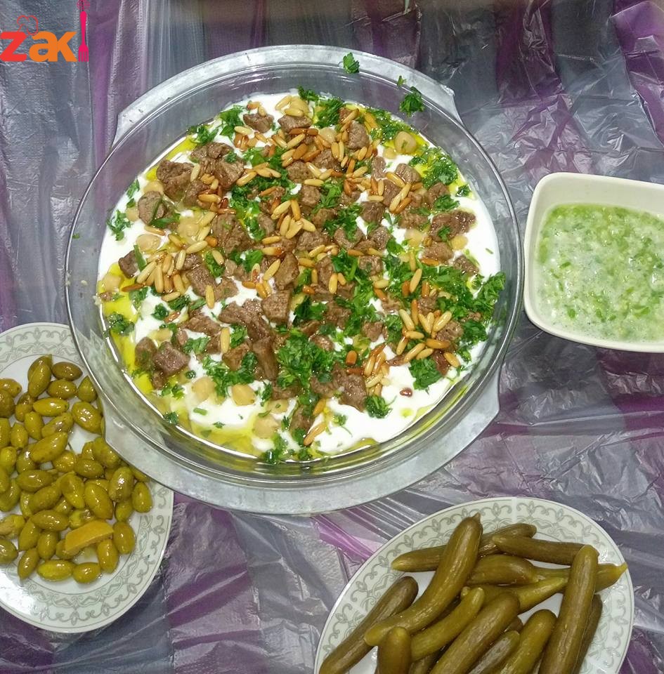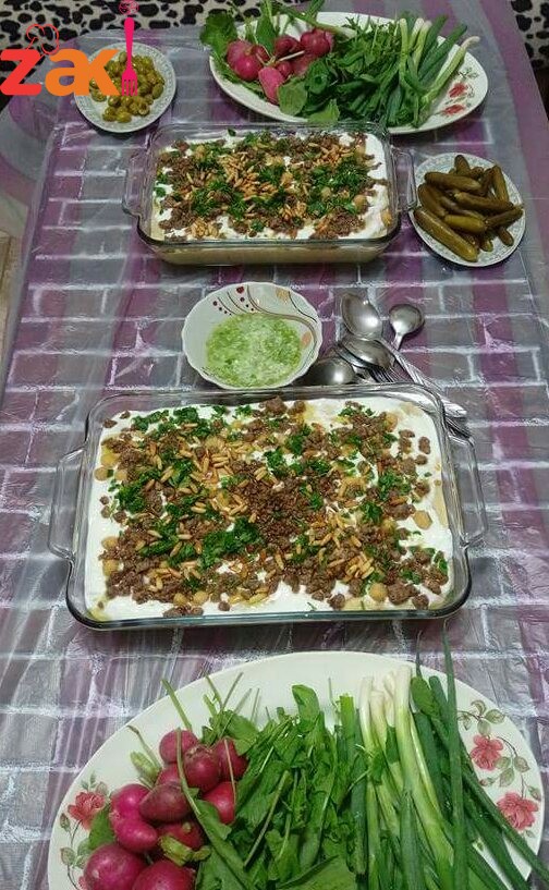 ثم نضع الان على الوجة لبن رايب نمده على جميع الصينية ثم الحمص الحب واللحمة المفرومة