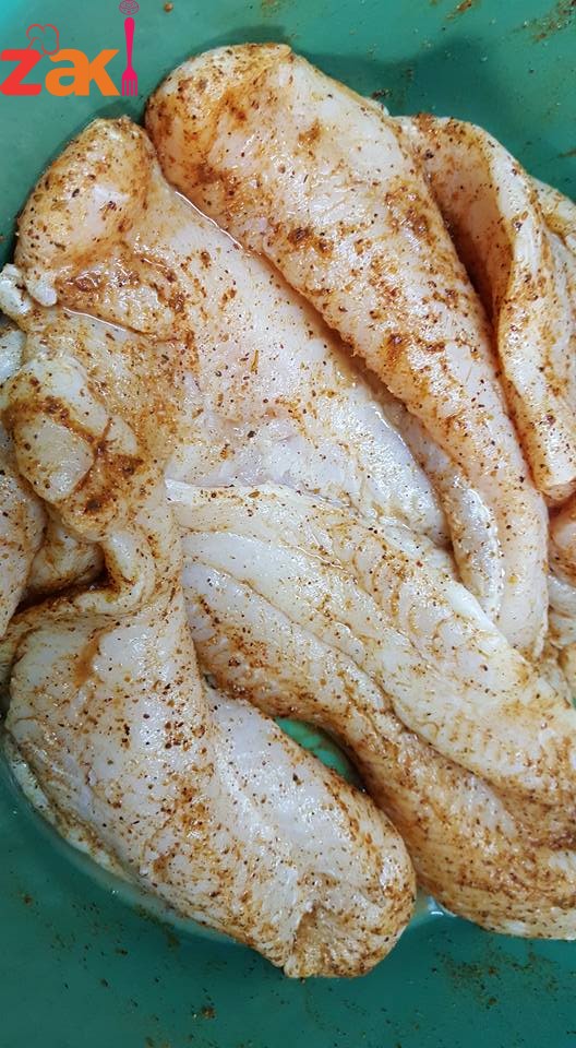 بنغسل السمك وبنصفيه تماما وبنحط عليه عصير ليمون ملح هيل كمون ببريكا