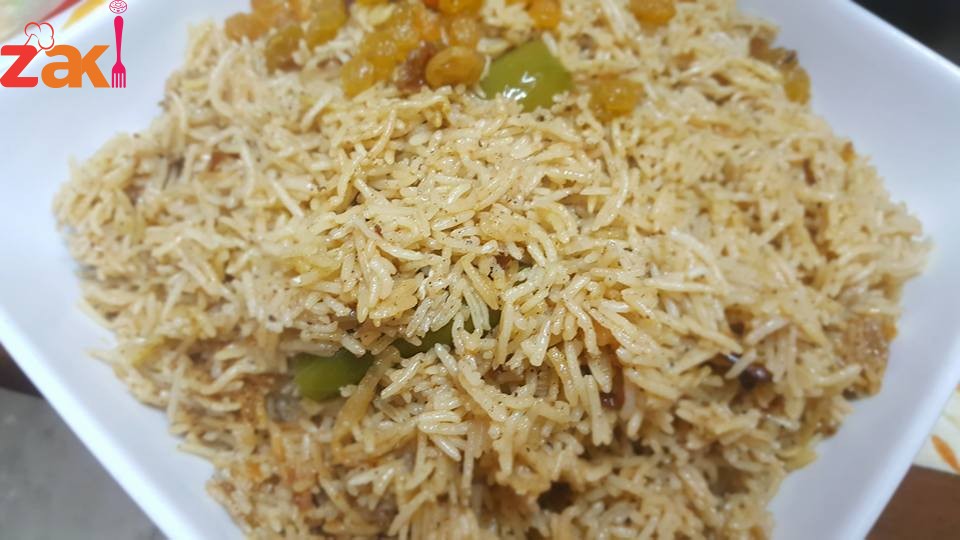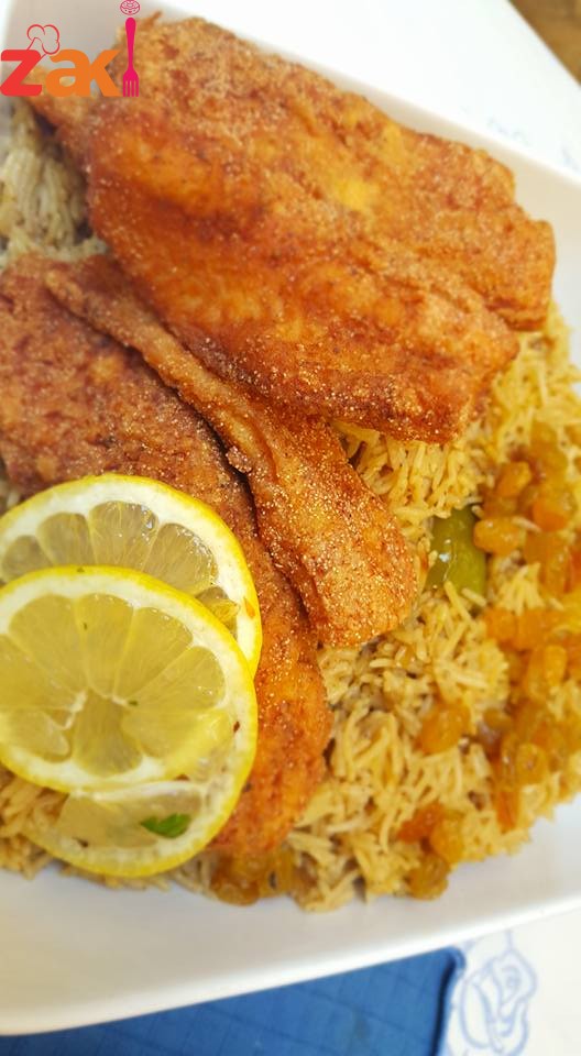 وبنزين الرز بسمك مقلي زبيب وبصل مقرمش
