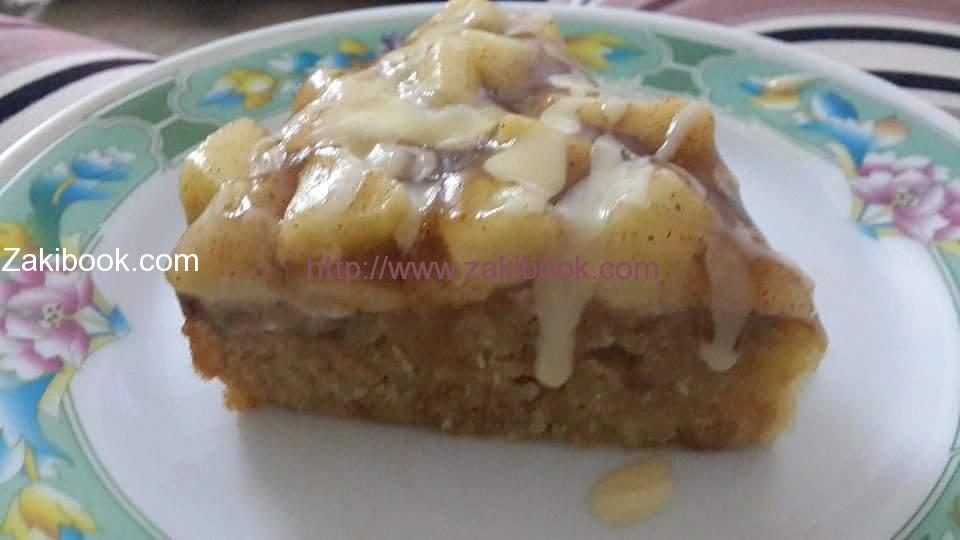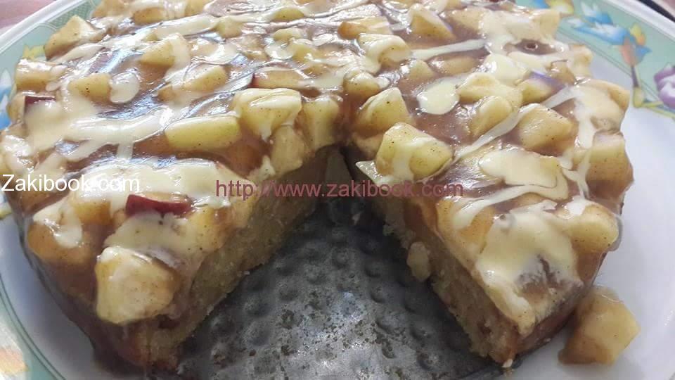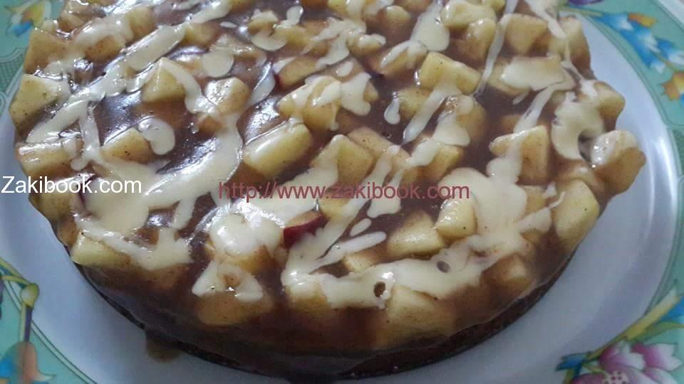 تفاحتين مقطعين صغار, نص كاسة سكر, كاسة ماء, ملعقة نشا كبيره, ملعقة قرفه صغيره, نحركهم علی النار ليجمد السائل و نحطهم سخنين فوق طبقة المكثف و نزين بمكثف محلی وبالعافيه.