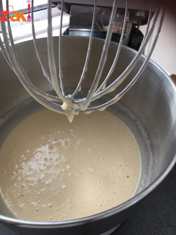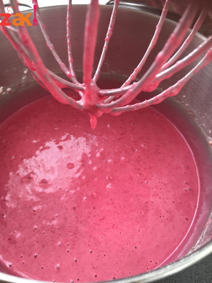 في الخلاط نضع اربعة بيض وكوب ونص سكر ونخلطهم حتى نحصل على مزيج كريمي نضيف كوب زيت نباتي ونخفف حتى يختفي الزيت نضيف الطحين وعصير الشمندر والبرتقال
