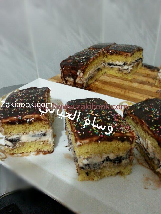– بعد ماستوى ستوى وبرد قصيتو من الوسط ودهنتو بلشيرة البارده  (القطر) وضعت صلصةالكاكاو وبعدين وضعت طبقه كريم شانته وبعدين بكاسه ذوبت نسكافيه وحليب مركز ونقعت البسكت وصفيتو فوك الكريمه وخليت الكيكة الثانيه وغلفتو بالكريمه ووضعت فوق الكريمه صلصة الكاكاو