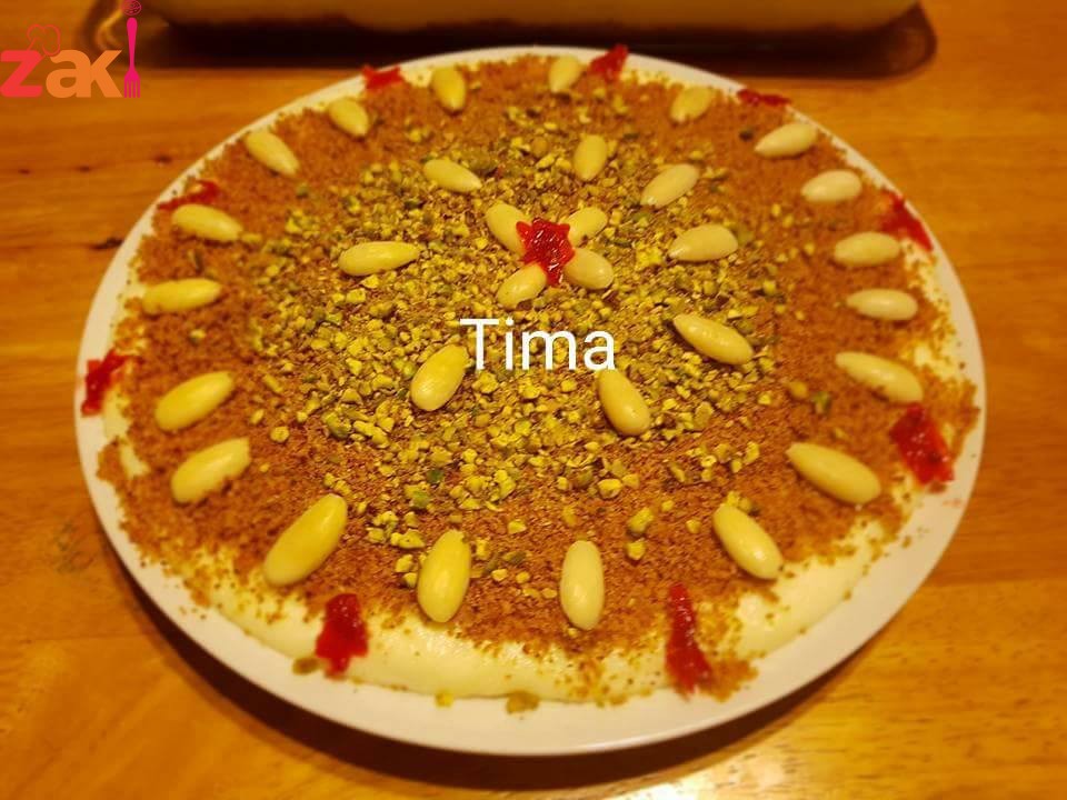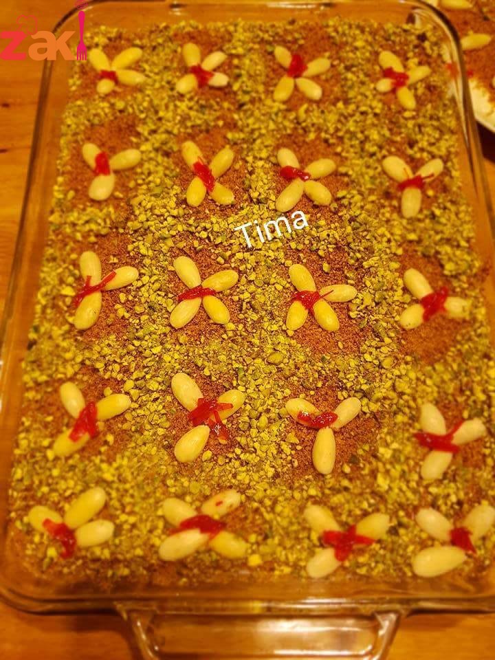 بسكبن بالجاط اللي فيها الكعك المحمص وبحط القسم الباقي من المعك المحمص عالوج وبزين بالفستف الحلبي حسب الرغبه