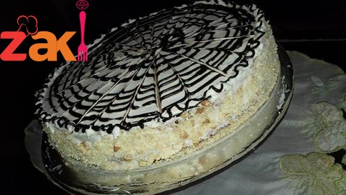 ثم يعاد توزيع الكريمة ونوزع كريمة الشوكولا بشكل لولبي على السطح